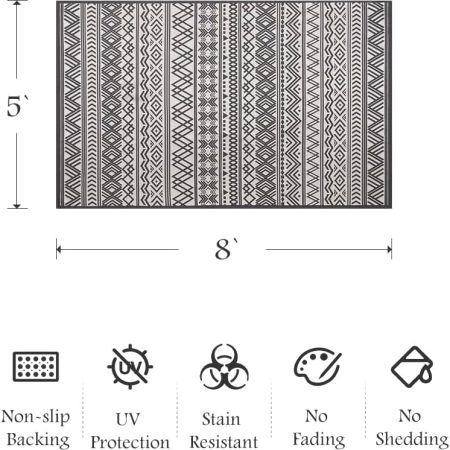 REVERSIBLE STYLE FOR YEAR-ROUND VERSATILITY: Switch up your space in seconds with this reversible outdoor rug 5x8 featuring a modern geometric pattern on both sides. Whether you’re styling your porch rug, balcony, or camping rug, one quick flip refreshes the entire vibe.