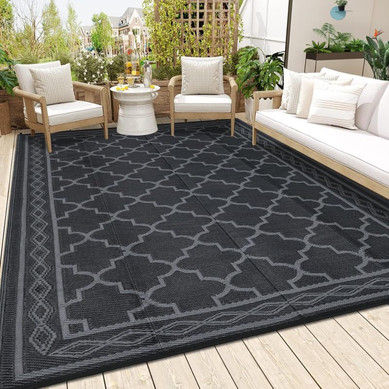 Outdoor Rug 8 x 10 Patio Waterproof, Foldable Reversible Plastic Straw Area Rugs Mat for Camper Decor, Outside Carpet for Rv, Deck, Porch, Picnic, Beach, Balcony (Black/Grey)