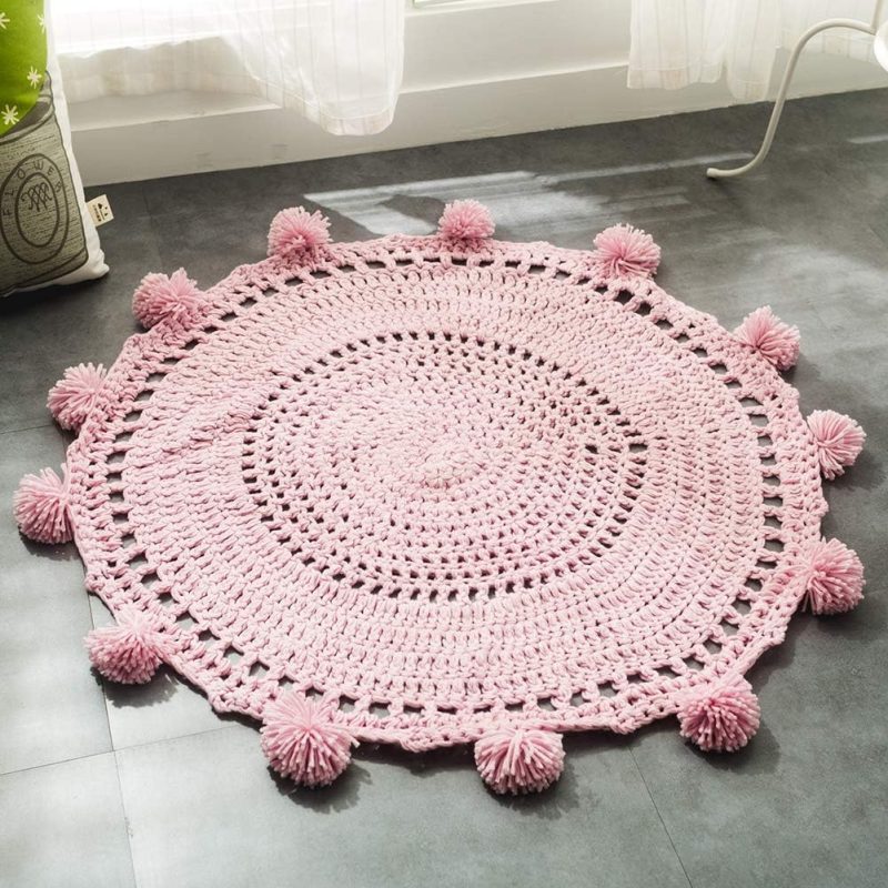 Pom Pom Round Crochet Area Rugs Soft Handmade Knit Solid Play Mat Kids’ Room Decorate Carpets Diameter 31″ Light Pink