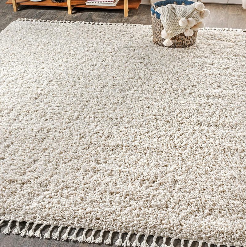 Shag Plush Tassel Indoor Area-Rug Bohemian Modern Contemporary Solid Easy-Cleaning Bedroom Kitchen Living Room, 8 X 10, Cream with Tassel